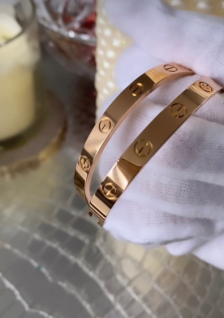 Cartier Rose Gold Love Bracelet, size 16. Oval bracelet composed of two rigid arcs to be worn on the wrist and removed using a specific screwdriver.