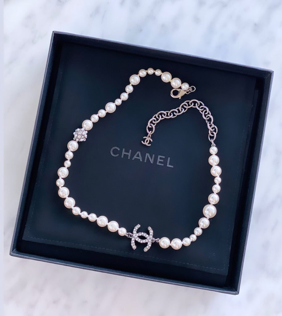 Chanel crystal-embellished faux-pearl necklace with signature interlocking CC logo. Lobster claw fastening. Stamp: A20 B.