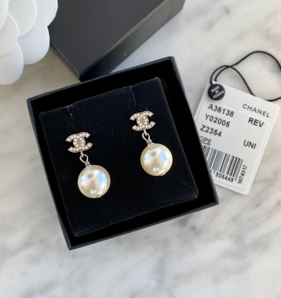 Designer: Chanel Crystal Pearl CC Drop Earrings. Serial code: A16 V.