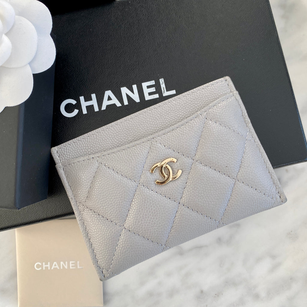 Chanel classic quilted card holder in light grey grained leather with gold-tone metal "CC" logo on the front.