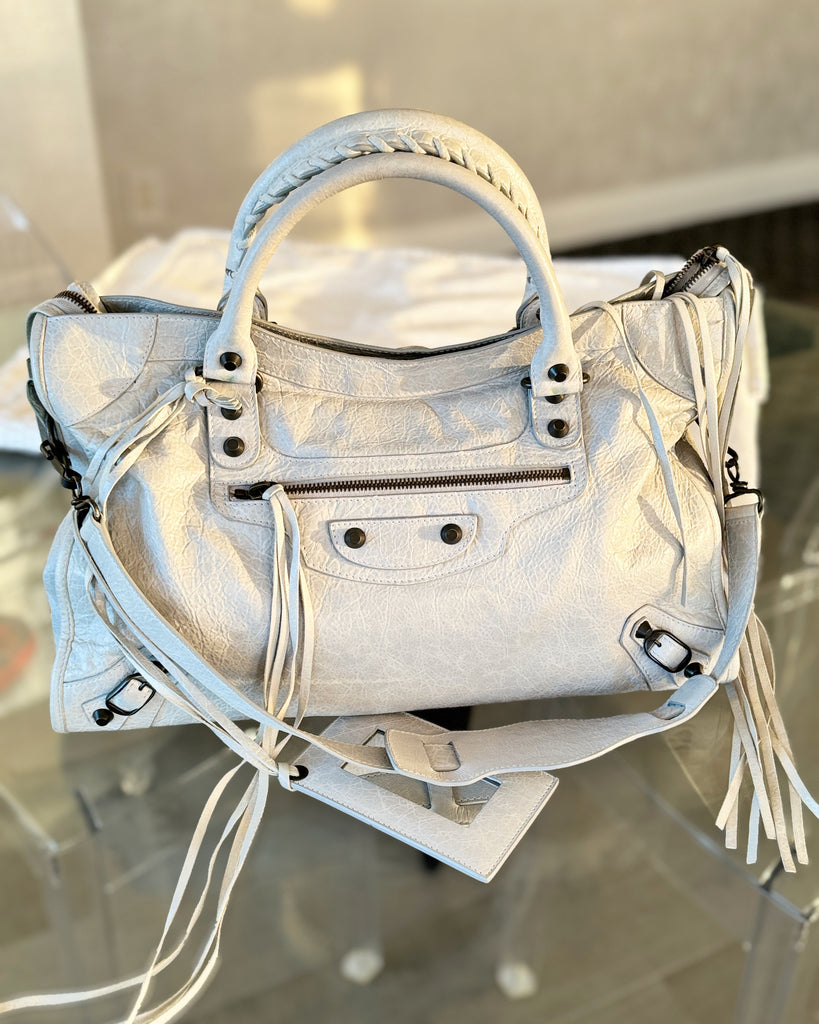 BALENCIAGA Classic City Shoulder Bag in pearl grey lambskin leather. The bag features two braided woven handle straps, long fringe details, leather framed hand mirror, front zipper pocket and iconic Balenciaga metal studs and accents. Its top zip closure opens to a spacious black fabric-lined interior with one zipper pocket. Its detachable shoulder strap allows for this bag to be worn on the shoulder.