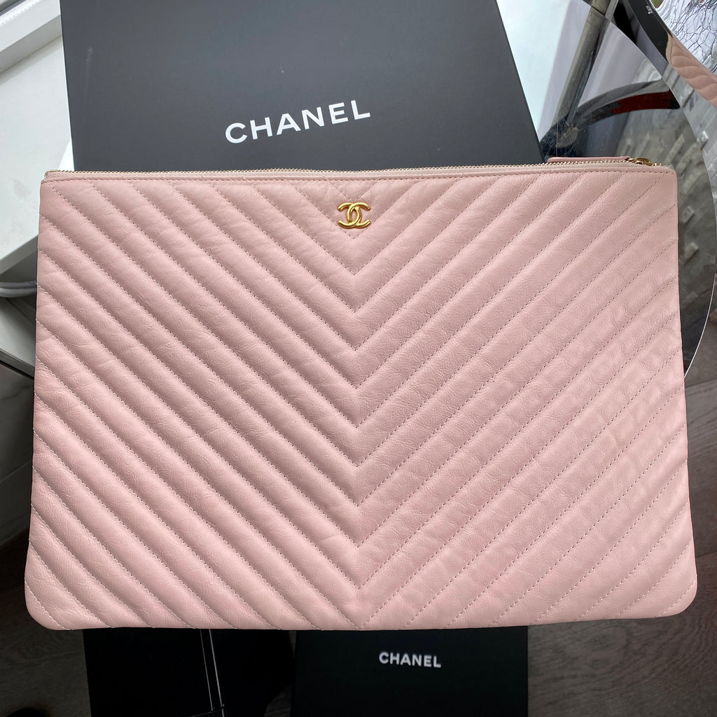 CHANEL Calfskin Chevron O Case in Large Size. Stylish and eye-catching, this bag is crafted to be worn for business purposes or as a daily pouch. It has a chevron quilting on the exterior, an exterior back slip pocket, a top zip closure, and an interior zip pocket. It is big enough to fit documents, cards, phone, iPad, Apple 13’ MacBook or other daily essentials. The O Case pouch is fashionable, glamorous, and most importantly, it holds value.