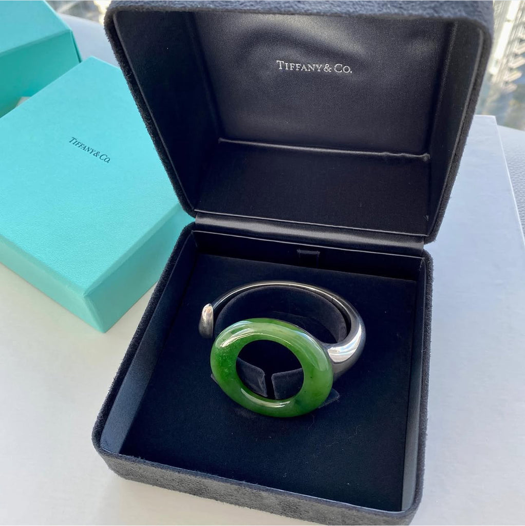 TIFFANY & Co. Elsa Peretti Sevillana Cuff Bracelet - exquisite cuff bracelet designed by Elsa Peretti. This piece is notable for its sculptural elegance. The bracelet features a hinged band for easy wear and fits wrists up to 6.5 inches. The deep green jade is set prominently atop the cuff, creating a bold elliptical focal point. The jade measures around 50 mm x 50 mm (1.97 x 1.97 inches).
