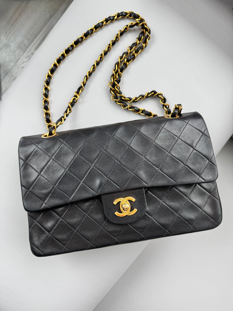CHANEL vintage medium double-flap shoulder bag in black lambskin. The bag is crafted in soft black calfskin leather, and the chain straps and CC lock are plated with 24-karat gold. This is a true luxury item, a dream bag of any fashion-loving person or Chanel collector, a token of old-world sophistication and glamour!