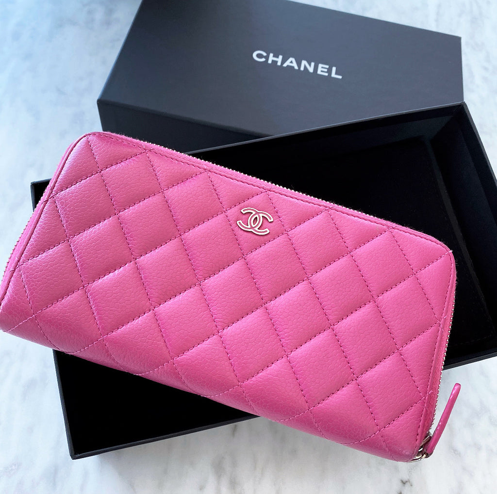 Chanel Classic Long Zipped Wallet crafted in pink caviar leather. It has three compartments, including a central zip pocket, eight card slots and two pockets.
