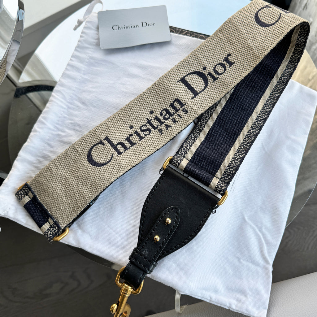 Navy Blue Christian Dior Paris embroidered shoulder strap is a unique accessory that allows the customization of many Dor bags. The Christian Dior Paris signature is featured at the center of the strap and is framed by navy blue calfskin on either side. It has two antique gold-finish metal snap hooks that can attach the strap to the bag. The style may be worn over the shoulder or crossbody. Adjustable length.