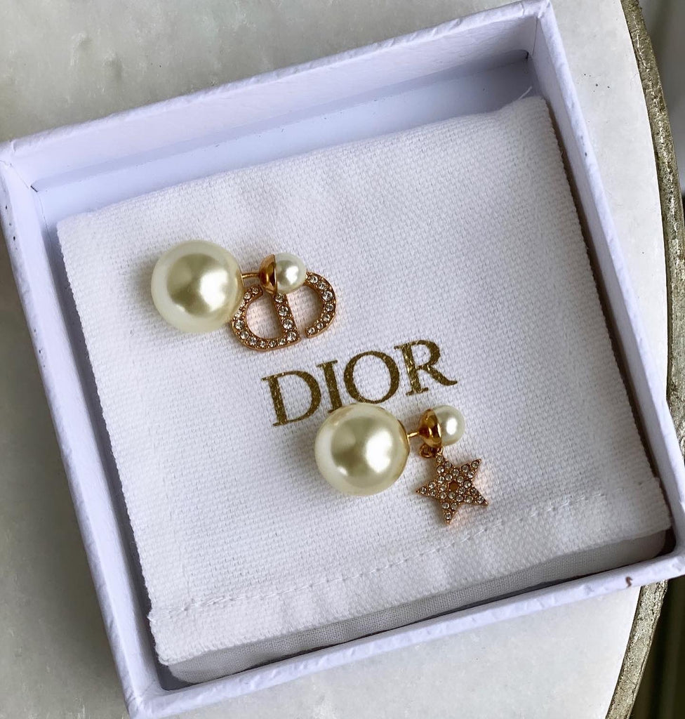 Description: asymmetric pair of earrings. One earring has a star attached to the rear pearl, and the other one has 'CD' initials attached to the real pearl. Integrated clasp on the rear pearl.