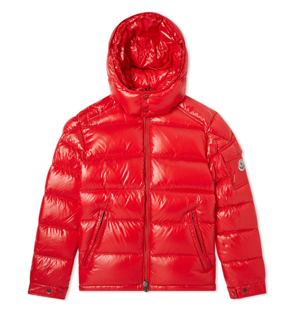 MONCLER Down Maya Jacket. Down-filled quilted nylon satin jacket with detachable hood and two-way zip closure at front. Stand collar, four pockets: one inside, two on the sides, and one on the sleeve with Moncler logo. Logo-engraved gunmetal-tone hardware.