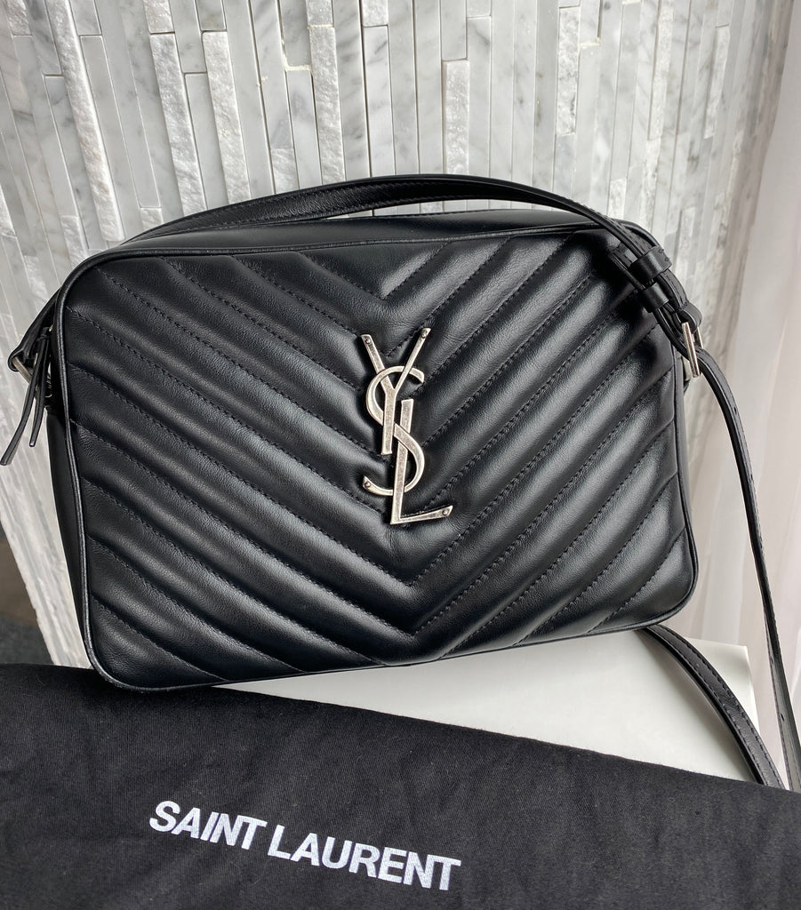 SAINT LAURENT LOU CAMERA shoulder bag in black quilted leather with an adjustable leather strap and removable tassel with YSL initials in silver-tone metal at the center. Zip closure. One main compartment and one flat pocket.